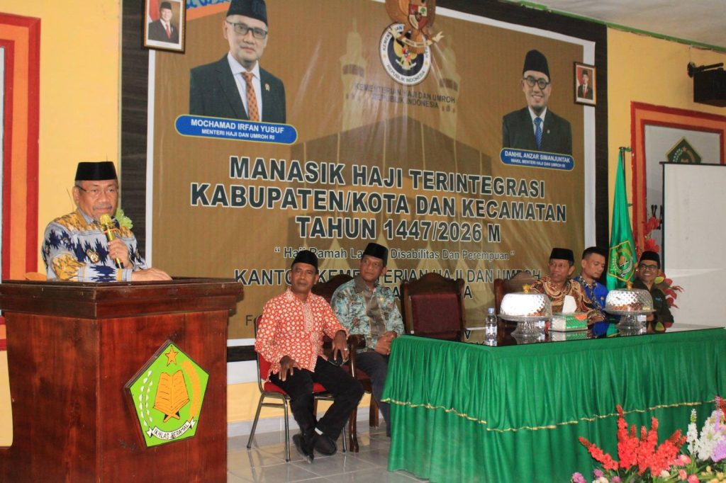 Raha(Humas Sultra)—Bertempat di Aula Kantor Kementerian Agama Kabupaten Muna, Bupati Muna(H. Bachrun) Buka secara resmi Kegiatan Manasik Haji Terintegrasi Kabupaten/ Kota Dan Kecamatan Tahun 1447 H/ 2026. Dengan Tema “Haji Ramah Lansia, Disabilitas Dan Perempuan” Yang diselenggarakan Oleh Kantor Kementerian Haji dan Umrah Kabupaten Muna. Kamis(12/02/2026)