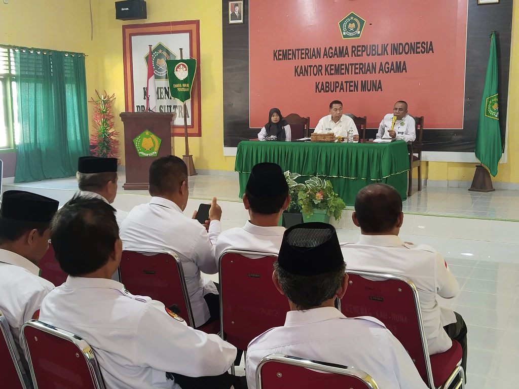 Raha(Humas Sultra)—Bertempat di Aula Kantor Kementerian Agama Kabupaten Muna, Pelaksana Tugas(Plt) Kepala Kantor Kementerian Agama Kabupaten Muna(Andilompo) Pimpin Rapat Koordinasi Percepatan Realisasi Pelaksanaan Anggaran Tahun 2026. pada Kantor Urusan Agama Kecamatan Se-Kabupaten Muna. Selasa(03/02/2026)