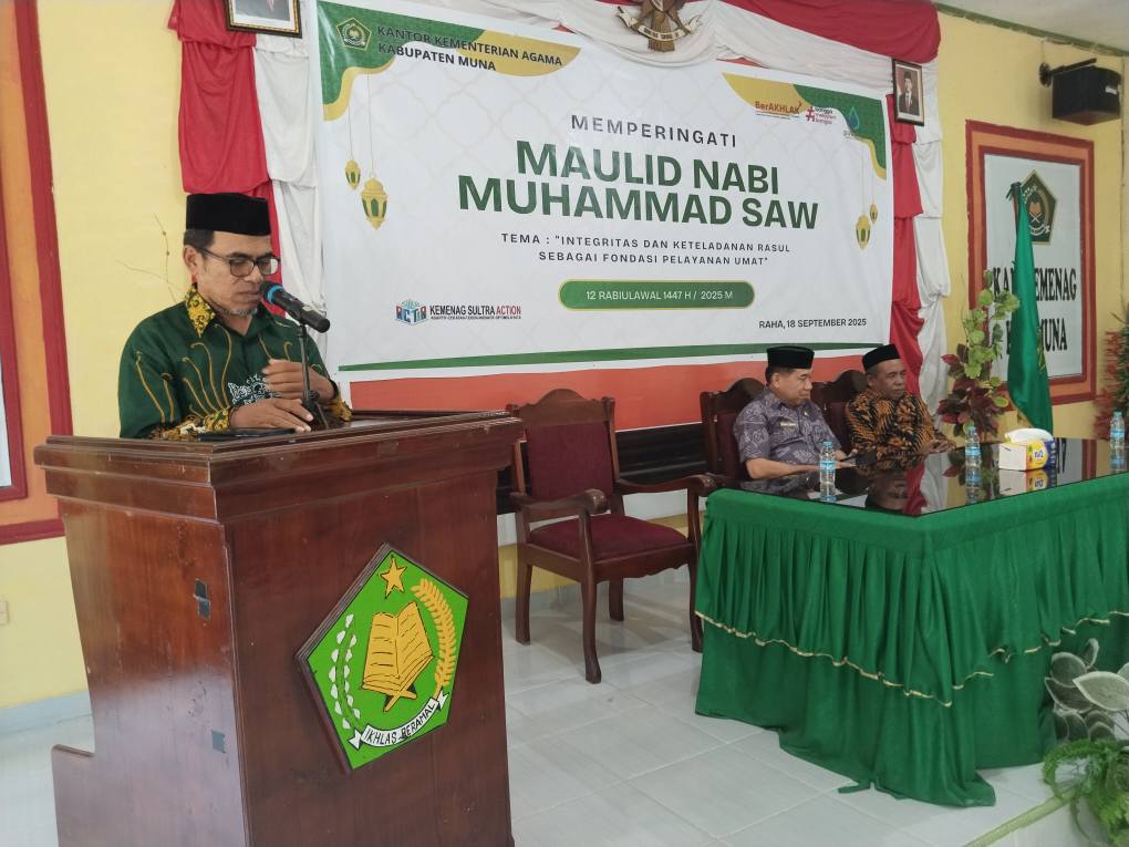 Bertempat di Aula Kantor Kementerian Agama Kabupaten Muna, Kantor Kementerian Agama Kabupaten Muna gelar Peringatan Maulid Nabi Muhammad SAW 12 Rabiulawal 1447 H/ 2025 M. Kamis(17/09/2025).